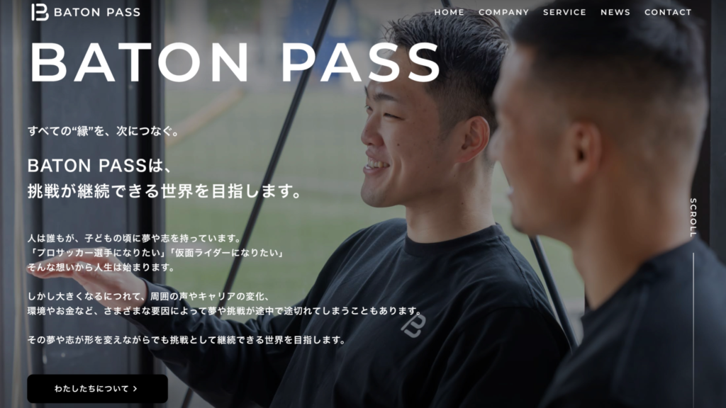 本プロジェクトでは、「すべての縁を、次につなぐ。」という理念を軸に、企業の考え方や事業内容が一貫して伝わる表現設計を目指しました。ロゴにおいては「BATON PASS」という社名に込められた“つなぐ”という意味を象徴的に表現すること、コーポレートサイトにおいては4つの事業内容が整理され、訪問者が直感的に理解できる構成とすることを方針としました。
